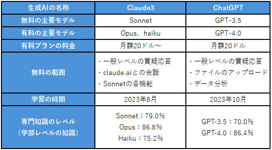 以下の表は、主要モデルを中心にClaude3とChatGPTを比較したものです。