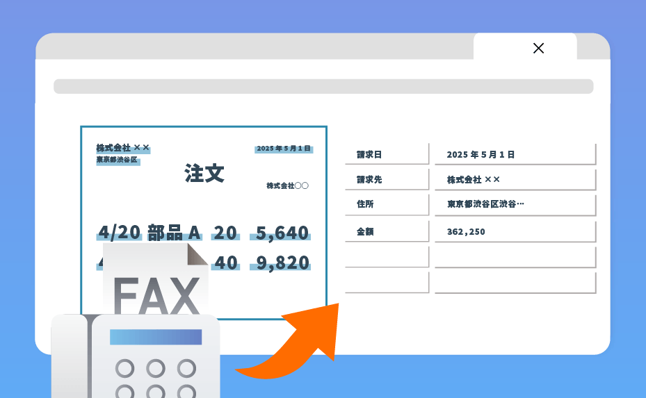 FAXで受信した注文書をAI-OCRで自動読み取りし、商品名・数量・納期などをデータ化する機能。手入力を削減し、受注業務の効率化と入力ミス防止を実現します。