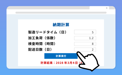 製造リードタイム+加工負荷+検査+配送などの条件に応じて、納期を計算する機能です。