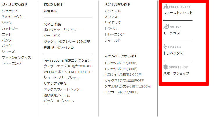 まずエディー・バウアーらしさが出ているのが、グローバルナビから商品ライン毎に絞り込むことができる点です。商品ラインは『ファーストアセント』『モーション』『トラベックス』『スポーツショップ』の4種類があります。