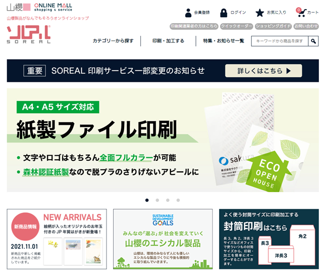 名刺印刷老舗の『山櫻』のECサイトは2カラムで、中央にカテゴリや名刺の種類などのリンクを配置し、全体的に情報を均一化しています。コーポレートカラーであるライトピンクを使用し、トピックスを大きく表示させることで、文字量が多くてもすっきりとした印象です。また、慶事や新年のあいさつなど、利用シーンをお客様に提示することで用途の幅を広げています。