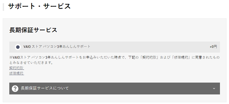『VAIO直営オンラインストア』は、ECサイトでの商品購入者に対して「長期保障サービス」の特典を無償で提供しています。3年間の保証サービスとなっており、これに申し込めば保障期間内の修理においてユーザーの費用負担は発生しません(※条件有り)。このような保証サービスを家電量販店で行うと数万円〜の料金が発生する場合が多いです。