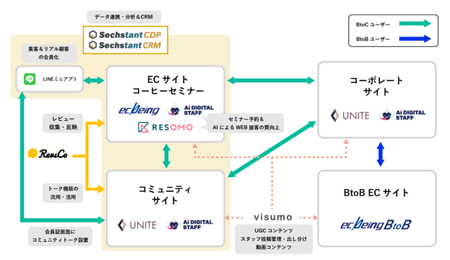 キーコーヒーでは、2022年に一般消費者向けECサイト「キーコーヒー公式オンラインショップ」をecbeingでリニューアルし、ECシステムのブラッシュアップと、顧客のファン化を促進するための環境整備を実施しました。さらに、2023年には弊社マイクロサービス※1「RESOMO(リソモ)」※2を導入し、コーヒーセミナー予約の仕組みを刷新するとともに、「LINEミニアプリ」※3の導入を通じて、店舗とECの会員体系・ポイントの共通化を図りました。