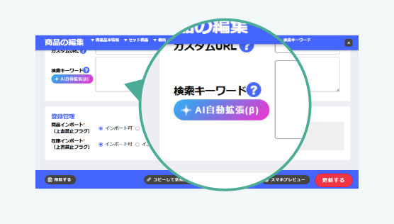 商品情報を解析し、AIが同義語や関連語、不足している検索キーワードを自動補完します。